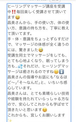 『ブラッシュアップレッスン(ヒーリングマッサージ)を受講して』 初級編のヒーリングマッサージで昌美先生にマッサージの楽しさを教えていただき、家族やお友達の身体をラクにしながら自分も楽しく過ごしたいと思うようになり、現在『マサミアプローチコース』を受講しています。 将来プロとして活動するにあたり、せっかく教えていただいたヒーリングマッサージも施術メニューとして取り入れたいと思ったので、ブラッシュアップレッスンをお願いしました。 講習では大まかなやりかたは覚えられましたが、手を当てるポイントを細かく覚えたほうがより一層マッサージの効果が出るのではないかと思ったからです。 自分をモデルにして昌美先生の施術を受けてマッサージの効果が実感できました。実際に体感することで、圧の強弱による気持ち良さの違いや、ツボをしっかり押さえたときの身体のゆるみかたなどを学ぶことが出来ました。 学びながらもプロの施術を受けることが出来てレイキヒーリングの効果も相まって身体も気持ちもスッキリするので、その後のレクチャーも楽しい気分で臨むことが出来ますし、頭をクリアにしてしっかりと技術を習得することが出来ます。なんてお得な講習なんだ!と思ってしまいました(笑) 実際のレクチャーでは、手の置き方・体重のかけ方・圧をかけていく方向など、ひとつひとつの動きを丁寧に修正して頂きました。正しい位置での施術は自分の手がクライアントさんの身体にすっぽりとフィットし、施術する自分の姿勢に無理がなくなって余計な力を使わずに済みます。また、手がフィットすることでクライアントさんの体感にも安定感が生まれて、一層リラックスしてもらえるのだと思いました。 ほんの少しポイントが違うだけで施術する側もされる側も楽しさが格段に変わります。 「なんとなくこのくらいかな?」と施術していましたが、受講することで自信が持てるようになりました。レクチャーはとても細かく微妙な修正なので根気が必要です。でも正しい位置に手が納まると「あっ!」と思わず声が出るほどフィット感が劇的に変わります。施術をしている自分のほうが一層楽しくラクになれます。昌美先生はおだてるのがお上手なので終始笑いっぱなしで本当に楽しくレクチャーを終えることが出来ました。 これからも昌美先生の確かな技術と可愛らしいお人柄から沢山のことを吸収させていただきたいと思っています。 川元瑠理 2019/8/12受講 |